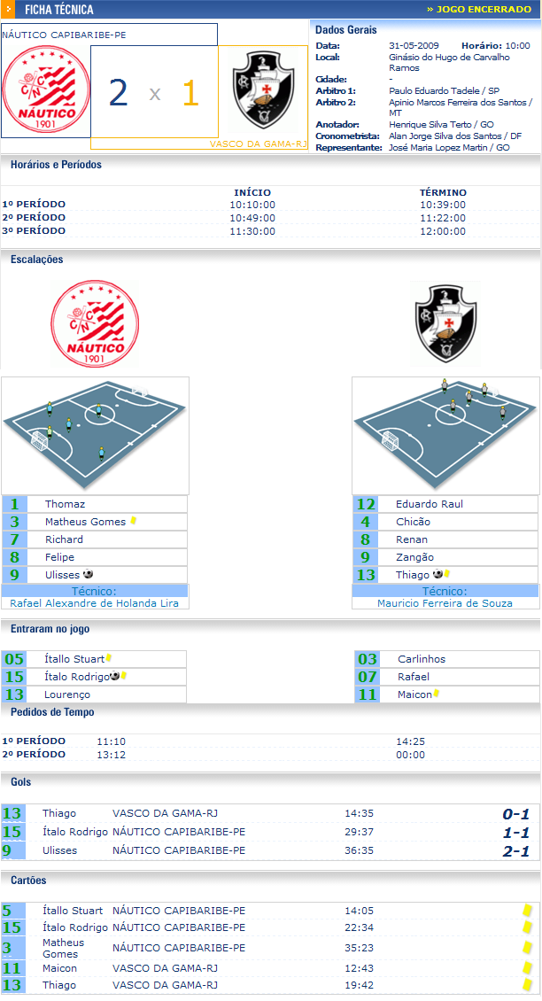 No segundo tempo, em desvantagem no marcador, os pernambucanos tentaram exercer um maior volume de jogo. A pressão resultou em algumas boas chances de gol, mas o goleiro di Vasco, Eduardo Raul, impediu que os pernambucanos empatassem. Faltando cerca de 1min30 para o término da partida o ala Felipe passou a exercer a função de goleiro-linha.