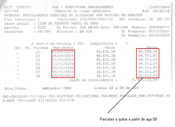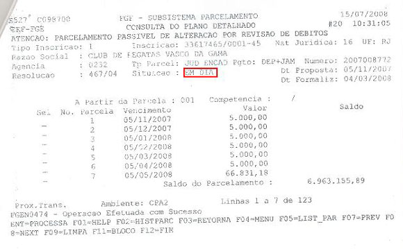 O parcelamento foi separado em duas partes, com os seguintes números: 2007008772 e 2007007718. A primeira com saldo a ser pago de R$ 8.356.167,91 e a segunda com saldo a ser pago de R$ 7.133.294,42, totalizando R$ 15.489.462,33, cerca de 1 milhão e 100 mil reais líquidos a menos do que aquilo previsto na confissão de dívida, valor referente à recuperação de créditos fiscais, que seguiria ocorrendo caso a “diretoria” atual não tivesse abandonado o constante monitoramento desta dívida. Ressalte-se que este monitoramento e as possíveis recuperações de créditos poderiam permitir novos abatimentos no parcelamento.