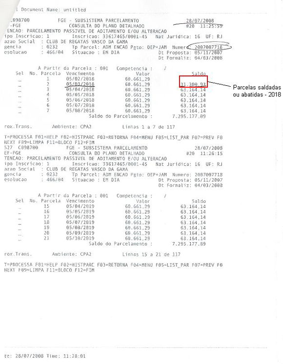 Abaixo, apresentamos o parcelamento quitado até julho de 2009 (possível pela recuperação de créditos), além de quitação/abatimento em 2018 (final do parcelamento).