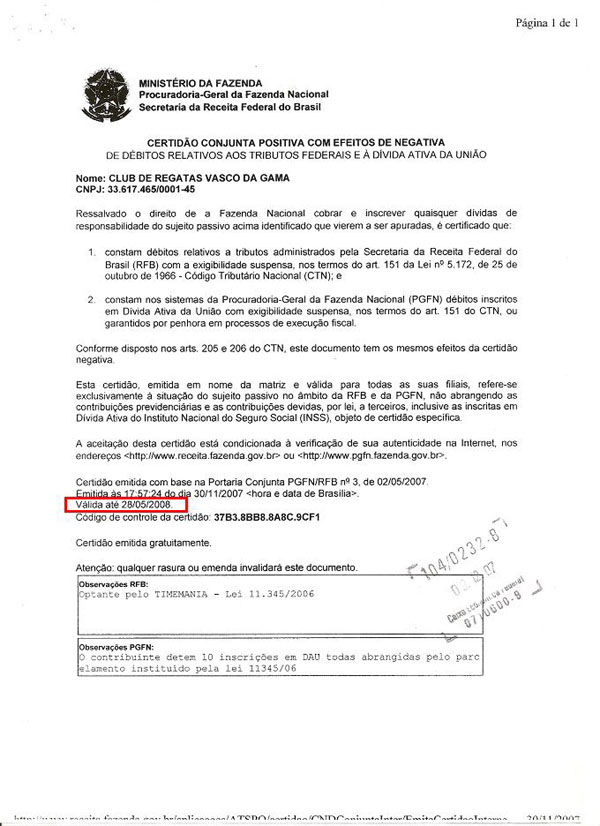 Ficou o Vasco da Gama com sua situação regular perante a Fazenda Nacional, conforme atesta a certidão emitida e discriminada no item 3.