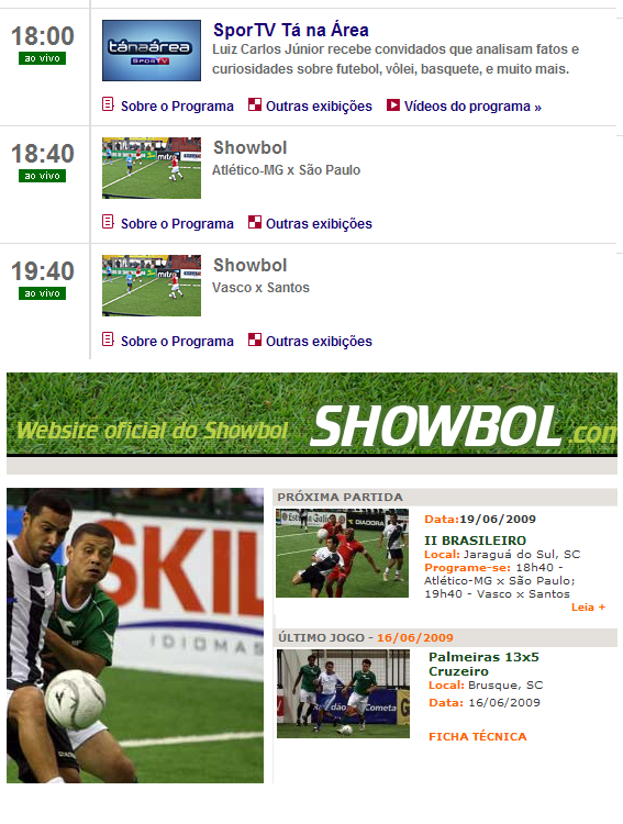 NETVASCO - 19/06/2009 - SEX - 21:11 - Showbol: Antecipação de jogo do Vasco frustra torcedoresTanto o site do Showbol (http://www.showbol.com) quanto o do Sportv informavam que Vasco x Santos, pelo II Campeonato Brasileiro da modalidade, começaria às 19h40min. Porém, uma mudança de última hora fez com que a partida se iniciasse uma hora antes, às 18h40min, enganando a própria NETVASCO e frustrando os vascaínos que não puderam curtir a vitória do Gigante da Colina por 5 a 4.