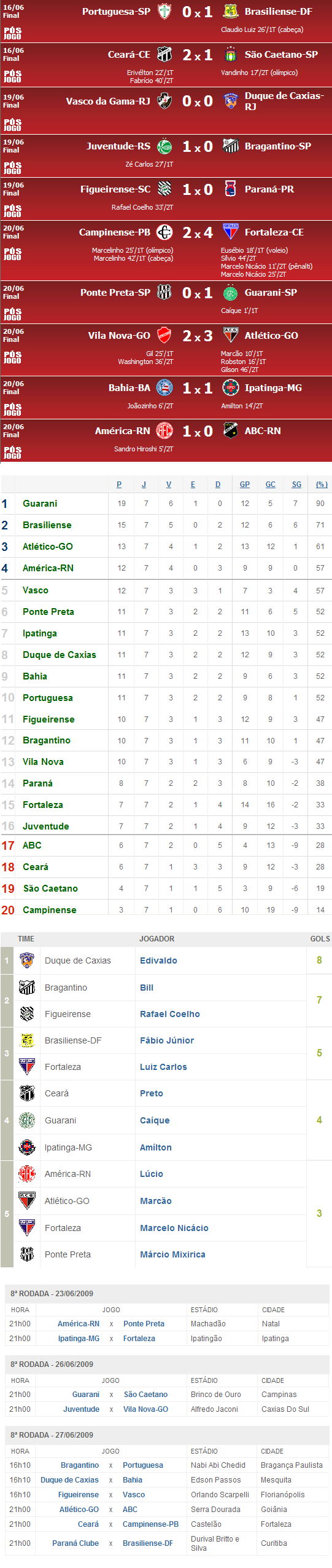 Fonte: NETVASCO (texto), Futebol Interior (resultados), GloboEsporte.com (classificação), UOL (artilharia, próximos jogos) índice | envie por e-mail Anterior: 21:51 - Oposição: Orçamento 2009 prevê receita de R$ 250 mil/mês com Habib's Próxima: 01:07 - Futsal: Confira a participação do Vasco na Liga Futsal 2009 |