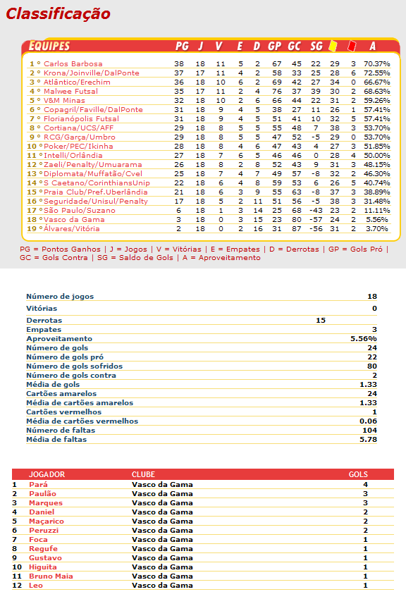 Fonte: Site da Liga Futsal índice | envie por e-mail Anterior: 23:26 - Vasco cai para 5º lugar e fica 7 pontos atrás do líder Guarani Próxima: 13:25 - Vítor Gava troca conforto de sua cidade natal por alojamento do Vasco |