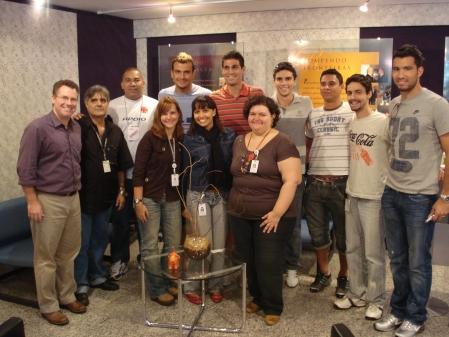 Fernando, Gian, Pimpão, Pará e Tiago posam para foto com funcionários do Senai/Cetiqt