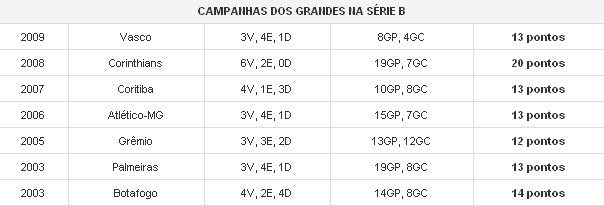 NETVASCO - 30/06/2009 - TER - 11:01 - Campanha inicial do Vasco na Série B é similar à de outros grandesSem vencer há cinco jogos na Série B, o Vasco já começar a ter focos de críticas e falta de confiança de alguns jogadores e de parte da torcida. Porém, desde que os clubes considerados grandes do futebol brasileiro começaram a amargar a queda de divisão, as campanhas nas primeiras rodadas do torneio não têm sido das melhores. No caso do time da Colina, apenas Corinthians e Botafogo tiveram um desempenho superior quando passaram pela Segundona.