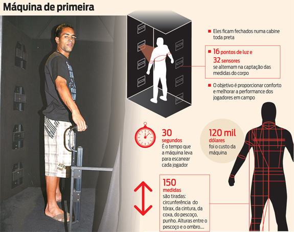 NETVASCO - 03/07/2009 - SEX - 02:08 - Saiba como funciona scanner que ajudará na elaboração dos uniformesOs uniformes dos jogadores do Vasco não se restringem mais aos tamanhos P, M, ou G. Em breve, cada atleta terá o seu uniforme customizado, ou seja, fabricado em cima de suas próprias medidas. Ontem, os goleiros Fernando Prass e Cestaro e o atacante Alex Teixeira estiveram no Senai Cetiqt — empresa responsável pelo estudo e dona do equipamento que custou cerca de R$ 250 mil —, no Riachuelo, para fazer a medição.