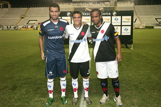 Goleiro Tiago, lateral-esquerdo Ramon e apoiador Carlos Alberto com a nova camisa do Vasco