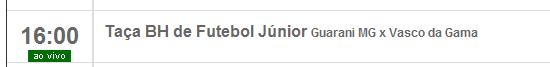 NETVASCO - 18/07/2009 - SÁB - 15:57 - Juniores: Sportv transmite Guarani-MG x Vasco pela Taça BH sábado às 16hPela Taça Belo Horizonte de Futebol Júnior, o Sportv transmite Guarani-MG x Vasco ao vivo neste sábado às 16h. É a 2ª partida da garotada vascaína na competição. Na estreia, uma goleada sobre a Seleção de Betim por 6 a 0.