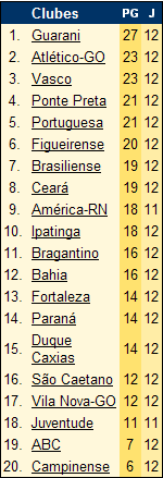 NETVASCO - 18/07/2009 - SÁB - 18:09 - Vasco está em 3º na Série B e a 4 pontos do líder GuaraniOs resultados da tarde sábado na Série B foram de certa forma favoráveis ao Vasco. O Atlético-GO venceu mas a Ponte Preta empatou, deixando o Gigante da Colina em 3º lugar e a apenas 4 pontos do líder Guarani, que perdeu a invencibilidade em casa para o Paraná. O jogo das 21h, América-RN x Juventude, não modificará a situação.