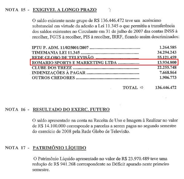 O Vasco deve a Romário. Assim que assumiram, após o golpe de julho de 2008, os novos “administradores” suspenderam o repasse das parcelas da dívida, feito pelo Clube dos Treze. A dívida, expressa em todos os Balanços Patrimoniais do clube desde que existe (conforme comprovado abaixo e desmentindo a colocação feita na nota da SRZD acima), foi colocada em xeque pelos “dirigentes” do “novo Vasco”, conforme declarações destacadas ao SRZD e ao O Dia. Aqueles que batem no peito dizendo que o clube, agora, é profissional, insistem em instituir o calote como tática de gestão. Aliás, tática conhecida por pelo menos um dos entrevistados, que passou pelo governo do estado e saiu em menos de 1 ano sem quitar o 13º salário do funcionalismo.
