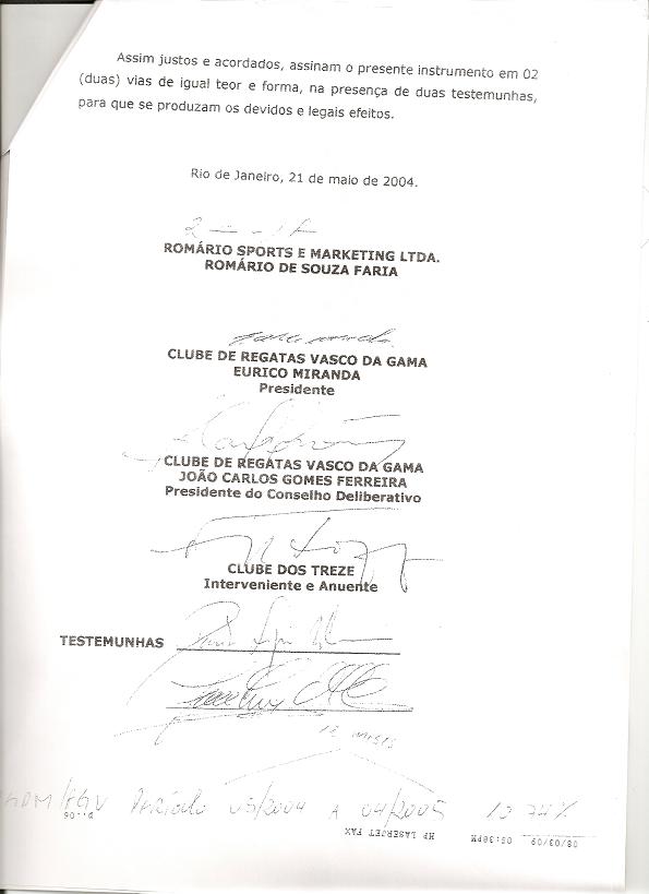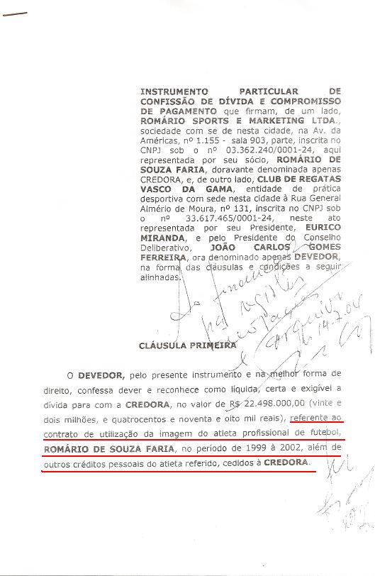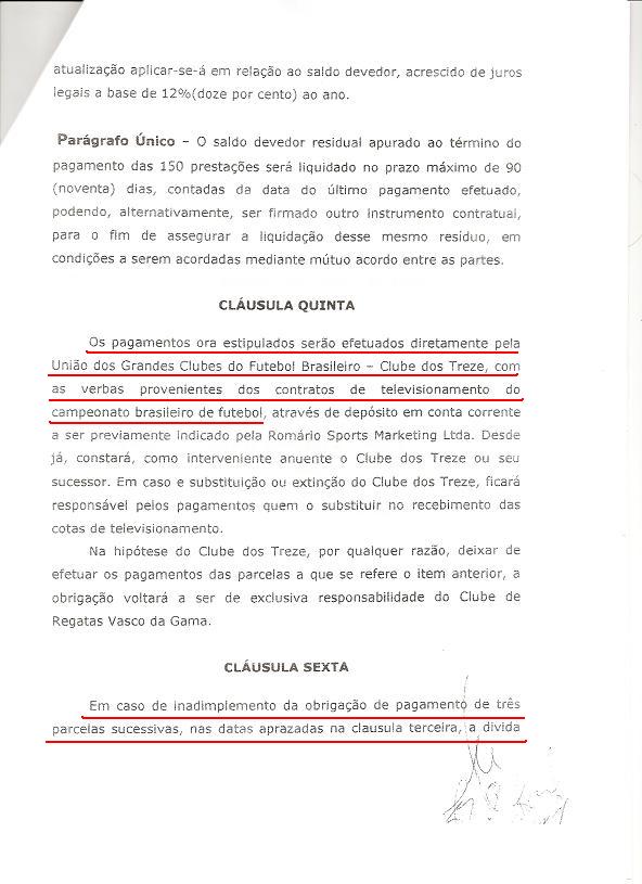A fim de desmascarar mais esta farsa, publicamos abaixo o acordo assinado entre Romário, Vasco e Clube dos Treze em 2004, referente à dívida feita com o ex-jogador entre 1999 e 2002. O documento é muito claro e fala por si. Destacamos as cláusulas principais, aquelas que põem por terra o discurso ensaiado dos atuais titulares do cofre vascaíno.