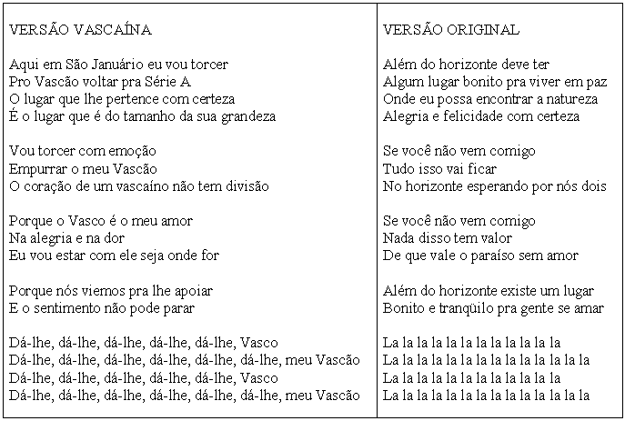 A torcida do Vasco vem cantando em São Januário uma criativa versão da música "Além do Horizonte", de Roberto Carlos e Erasmo Carlos, ambos vascaínos. Confira a letra e alguns vídeos: