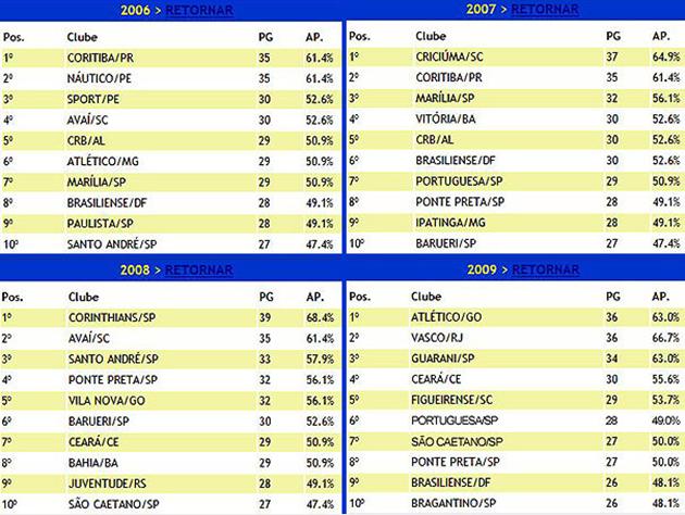 Em 2008, o Corinthians ficou na liderança em 18 das 19 rodadas do primeiro turno. Só na primeira, devido aos critérios de desempate, o time paulista ocupou o terceiro lugar apesar de ter os mesmos três pontos do então líder Juventude. Já o Vasco viveu uma situação bem diferente. A equipe só conseguiu liderar a competição este ano por uma rodada: a terceira. O primeiro lugar pode ser recuperado só agora, na última partida do primeiro turno, com uma vitória ou empate com o Ipatinga, no Maracanã. Isso porque o Atlético-GO perdeu nesta terça-feira para o Bahia e deixou o caminho aberto para os vascaínos.