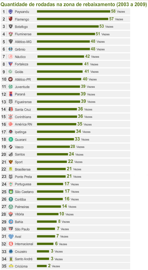 A equipe do Pará tem o recorde de frequência na zona da degola. Enquanto esteve na Série A (de 2003 a 2005), figurou entre os quatro últimos em 58 rodadas. De tanto insistir, acabou caindo para a Série B em 2005 e seguiu a ladeira para a Série C em 2006. Na vice-liderança do ranking de rebaixamento está o Flamengo. O Rubro-Negro esteve 57 vezes ameaçado de cair, mas até hoje se mantém firme na elite do futebol. Algumas dessas fugas foram obtidas apenas nas últimas rodadas.
