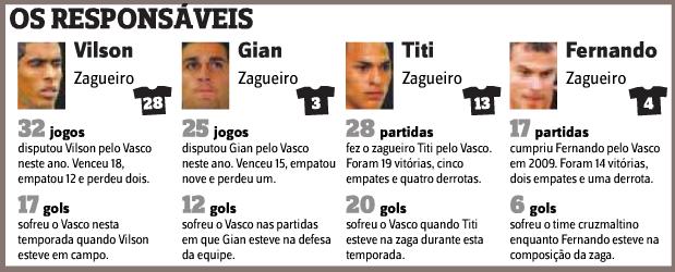 No duelo com Ronaldo, Vílson e Gian formaram a zaga e agora curtem o bom momento da defesa. Os elogios, claro, são para todo o grupo e para o técnico Dorival. Vílson, por exemplo, fez parte da defesa que virou motivo de chacota durante a campanha do rebaixamento de 2008. Na última temporada, foram 107 gols sofridos pelos vascaínos. Algo inimaginável hoje.