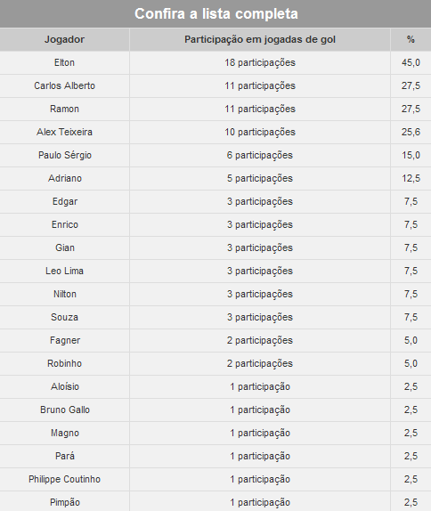 Na lista abaixo é interessante notar a presença de Leo Lima, jogador que já não faz mais parte do elenco (foi para o Goiás), mas deixou a sua cota de ajuda na campanha vascaína: participou de 3 gols (7,5%). Apesar da desconfiança do torcedor, o lateral Paulo Sérgio (6 participações) e o atacante Adriano (5 participações) também tem bom retrospecto no ataque e contribuições aos gols vascaínos.