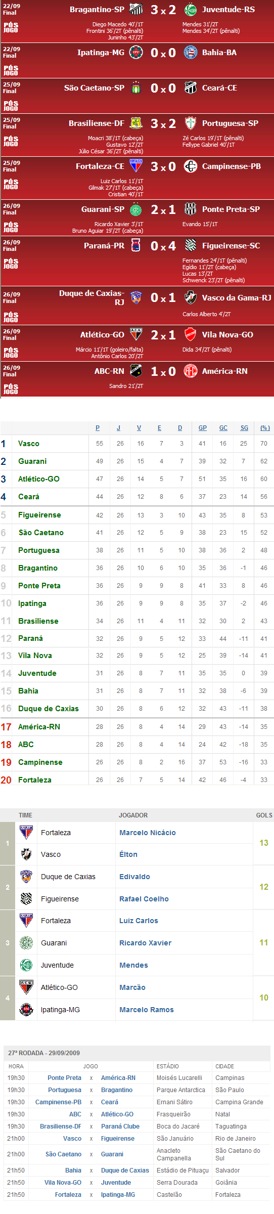 Fonte: Futebol Interior (resultados), GloboEsporte.com (classificação), UOL (artilharia, próximos jogos) índice | envie por e-mail | espalhe Anterior: 19:52 - Dorival Júnior critica recuo excessivo do Vasco Próxima: 00:26 - Mirim/Pré-Mirim: Vasco obtém 3 vitórias na Copa Light |