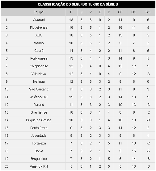 O Guarani, segundo na classificação geral, lidera a segunda etapa da Série B, com 18 pontos. A equipe paulista possui o maior número de vitórias do returno: 6. A vitória sobre o São Caetano fez a equipe encostar ainda mais no Vasco e ameaçar a liderança geral da equipe de São Januário (tem 52 pontos contra 55 do líder). O Figueirense, que tem mostrado poder de reação, alcançou a vice-liderança do segundo turno justamente após a vitória sobre o time carioca. Outro que merece destaque é o ABC, que se afastou da zona de rebaixamento graças ao bom desempenho no returno e já tem a terceira melhor campanha na segunda etapa da Série B.