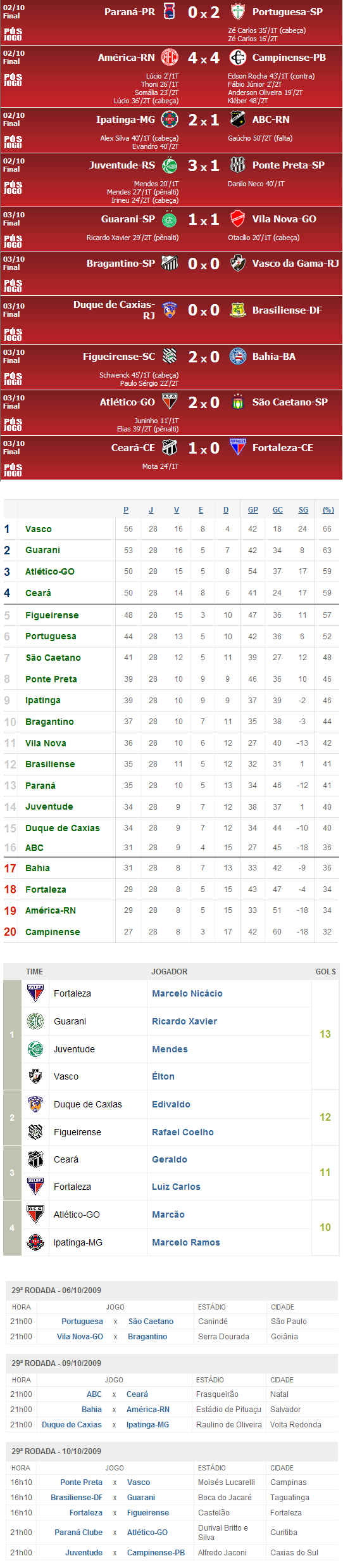 NETVASCO - 04/10/2009 - DOM - 02:23 - Diferença do Vasco para o 5º colocado cai de 10 para 8 pontosTerminada a 28ª rodada do Brasileiro da Série B (9ª do returno), o Vasco, que empatou com o Bragantino por 0 a 0, se mantém líder e 3 pontos à frente do vice-líder Guarani. Por outro lado, a vantagem para o 5º colocado, que atualmente é o Figueirense, caiu de 10 para 8 pontos.