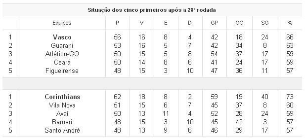Após a 28ª rodada em 2008, corintianos estavam com 62 pontos e 73% de aproveitamento, ou seja, seis pontos a mais que o Vasco tem agora. A distância para os rivais abaixo da tabela também era maior. O segundo colocado na época, o Vila Nova-GO, tinha 51 pontos, contra os 53 que tem o Guarani, vice-líder em 2009. A situação do primeiro time fora do G-4 é idêntica. No ano passado, o Santo André possuía os mesmos 48 pontos que tem o Figueirense nesta edição.