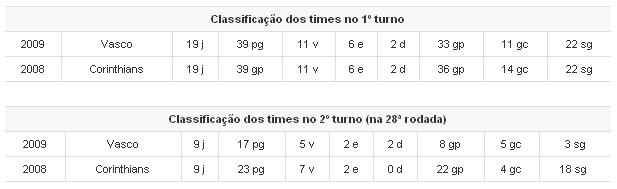 Dividindo o campeonato em duas partes distintas, é possível perceber em que ponto a campanha vascaína sofreu um revés em comparação à corintiana. No primeiro turno, os desempenhos são praticamente idênticos. Mesmo número de pontos, vitórias, empates, derrotas, além de saldo de gols igual. As diferenças estão presentes apenas no desempenho dos ataques e defesas. O Timão fez mais gols: 39. O Vasco sofreu menos: 11. No segundo turno, bastaram dois vacilos do time carioca para tornar a disputa desigual. As duas derrotas para Ceará e Figueirense foram suficientes para que a diferença de pontos para o Corinthians subisse para seis. No saldo de gols, o desnível é ainda maior: 18 para corintianos, três para vascaínos. Confira as comparações detalhadas nas tabelas abaixo: