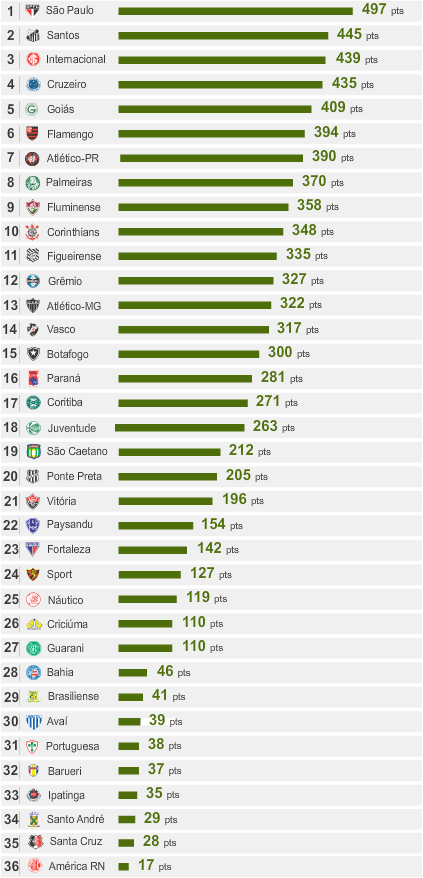 Logo atrás do São Paulo está o rival Santos, que, graças à vitória sobre o Sport, no Recife, chegou a 445 pontos. Apenas oito times disputaram todos os campeonatos da Série A desde 2003: além dos dois paulistas, Internacional, Cruzeiro, Goiás, Flamengo, Atlético-PR e Fluminense. Não por acaso estão no topo desta tabela de pontuação histórica. Apenas o Tricolor carioca, bastante ameaçado pelo rebaixamento neste ano, fica atrás de uma equipe que jogou a Série B. O Palmeiras, atual líder do Brasileirão, soma 370 pontos em 230 jogos contra 358 em 276 partidas do Flu.