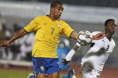 A melhor chance do Brasil no primeiro tempo aconteceu logo aos dez minutos. Giuliano cobrou falta do lado esquerdo da área, o chute saiu cruzado, forte, e Paulo Henrique Ganso, na pequena área, por pouco não desviou de cabeça para dentro do gol. Três minutos depois, Diogo fez um grande lançamento. Do campo defensivo, encontrou Alex Teixeira na entada da área. Ele tabelou com Alan Kardec e finalizou com força, para defesa segura de Agyei.