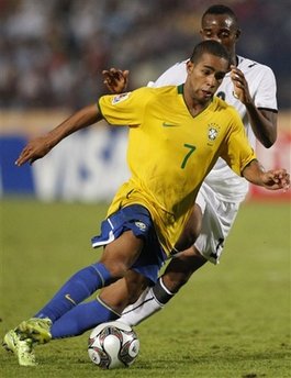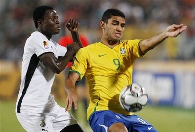 E o Brasil começou a prorrogação desperdiçando uma chance incrível. Depois de ótimo lançamento de Souza, Alex Texiera arrancou pela esquerda, entrou na área, foi até a linha de fundo e cruzou rasteiro. Alan Kardec, sozinho, deixou a bola passar, mas ela chegou a Maicon. Cara a cara com Agyei, ele mandou uma bomba mas o goleiro ganês defendeu.
