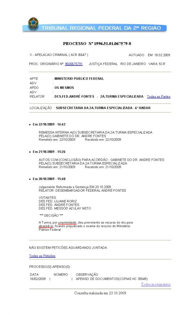 O documento acima comprova a queda do último processo criminal daqueles sofridos pelo ex-presidente Eurico Miranda, todos em função de sua luta pelo Vasco.