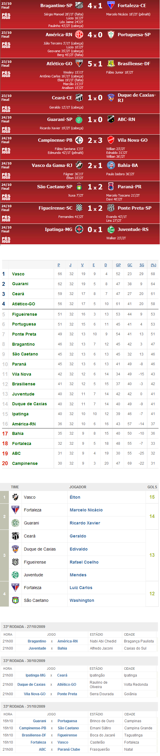NETVASCO - 25/10/2009 - DOM - 00:15 - Vasco a 4 pontos do vice-líder e a 15 do 5º colocado; Élton artilheiroTerminada a 32ª rodada do Brasileiro da Série B (13ª do returno), o Vasco, que derrotou o Bahia por 2 a 1, segue como líder e mantém sua vantagem de 4 pontos para o vice-líder Guarani. A dianteira em relação ao 5º colocado, o Figueirense, subiu de 12 para 15 pontos. O acesso à Série A pode ser matematicamente garantido no próximo sábado, 31/10, contra o Fortaleza, no Castelão.