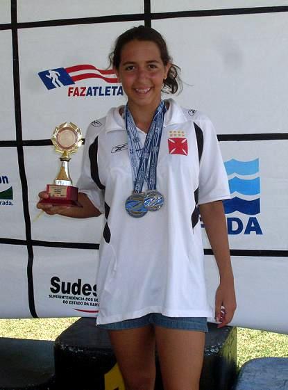 Nadadora vascaína Mariana Mello com troféu e medalhas