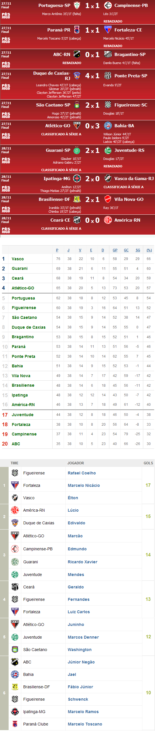 NETVASCO - 29/11/2009 - DOM - 03:04 - Vasco termina a 7 pontos do 2º colocado e Élton conquista artilhariaTerminada a 38ª e última rodada do Brasileiro da Série B (19ª do returno), o Vasco, que perdeu para o Ipatinga por 2 a 0 mas já havia se sagrado campeão por antecipação na 36ª rodada, terminou o campeonato 7 pontos à frente do vice-campeão Guarani.