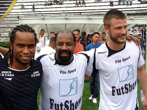 NETVASCO - 08/12/2009 - TER - 17:51 - Chuva atrapalha e só 400 torcedores vão a jogo beneficente em SJOs atores Rodrigo Hilbert e Aírton Graça participaram da partida beneficente organizada por Carlos Alberto e Vágner Love, em São Januário. O confronto, batizado de "Duelo das Tranças" reuniu vários jogadores do futebol brasileiro. O craque do Brasileirão, Diego Souza, do Palmeiras, esteve presente ao evento. Além dele, Léo Moura, do Flamengo, Diguinho, do Fluminense, e outros atletas estiveram na festa. A chuva atrapalhou o jogo, que contou com cerca de 400 torcedores.