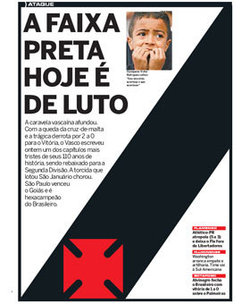 NETVASCO - 10/12/2009 - QUI - 10:40 - Capa de O Dia sobre rebaixamento do Vasco recebeu prêmio de jornalismo Foi com essa capa aí, retrato fiel do rebaixamento do Vasco, que o DIA acaba de faturar o Prêmio Esso, categoria Primeira Página. É criativa, é bonita, e, claro, um orgulho para nossa equipe levantar um prêmio dessa grandeza, ainda mais tendo como tema o futebol, paixão que me traz com boa frequencia a este blog. Mas fica aqui a torcida para que, no futuro, o esporte consiga ser fonte de inspiração mais suave, mais doce, mais feliz. Para que o orgulho pelo prêmio não tenha a sombra de uma recordação amarga. E que a gente possa botar a cruz de malta sempre no lugar que ela merece. Pra cima, colada no coração. Parabéns aos envolvidos.