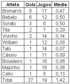 Vagno Célio do Nascimento Silva – Muito vigor e pouca experiência. Vinha cumprindo boas atuações até se contundir na partida contra o Palmeiras. Fez um gol de falta.