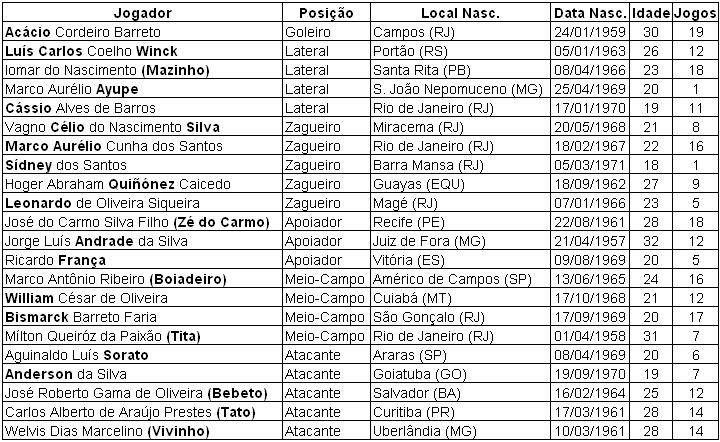 José Roberto Gama de Oliveira (Bebeto) – Sua polêmica contratação foi uma verdadeira aula de como dar uma rasteira no maior rival fora dos gramados. Duas décadas depois, há quem ainda não se conforme de como o Urubu pode perder seu maior craque – Zico já estava para se aposentar – em atividade. Com 25 anos, o baiano já mostrava grande amadurecimento, principalmente, depois das belas atuações que teve com a camisa da seleção brasileira na recém-conquistada Copa América. Vivendo ainda um momento de estafa muscular, o jovem Bebeto demorou a emplacar no novo clube. Mas da metade para a fim da competição se tornou o líder que o time necessitava. Comandava as ações ofensivas com a inteligência que todos já sabiam possuir. Craque de bola.