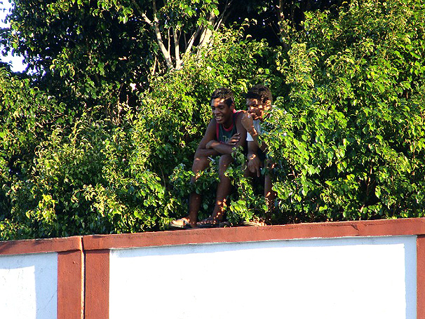 Por cima de um muro, torcedores veem treino
