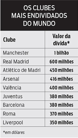 NETVASCO - 16/01/2010 - SÁB - 15:10 - Gigantes do futebol europeu também têm dívidas astronômicasNo ano em que se realiza a Copa, o maior evento esportivo do planeta, os balanços dos principais times do mundo apresentam o mesmo e surpreendente traço vermelho. Gigantes como Manchester United, da Inglaterra, Real Madrid, da Espanha, e Juventus, da Itália, fecharam 2009 com dívidas astronômicas.