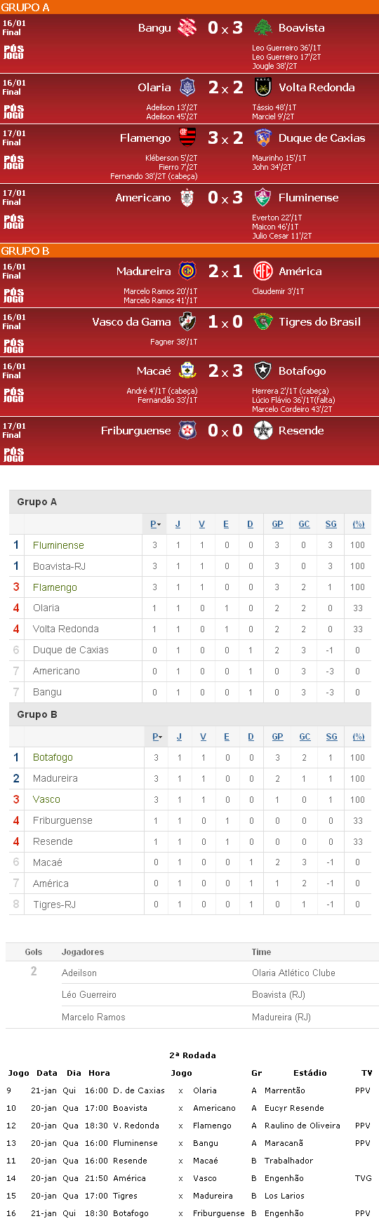 Fonte: NETVASCO (texto), Futebol Interior (resultados e autores dos gols), GloboEsporte.com (classificação), GloboEsporte.com (artilharia), Site da FFERJ (próximos jogos) índice | envie por e-mail | espalhe Anterior: 00:25 - Hoje, 2ª-feira, é dia de 'Casaca no Rádio' Próxima: 02:22 - Élton pode ser anunciado nesta segunda-feira |