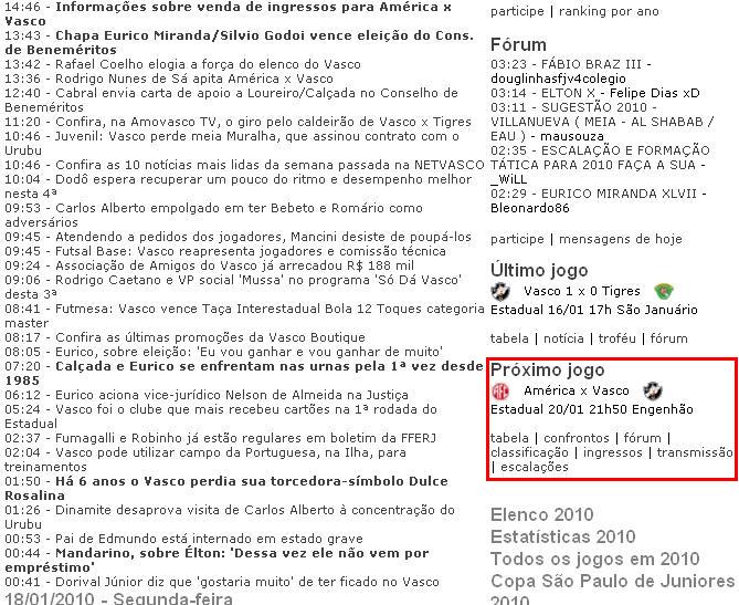 NETVASCO - 20/01/2010 - QUA - 08:40 - O 'Serviço' da NETVASCO mudou!Nos últimos anos os vascaínos se acostumaram a ver na NETVASCO, a cada dia de jogo do Vasco, uma notícia com o "Serviço" da partida. Em 2010 o formato mudou. Agora, as informações encontram-se distribuídas nos links logo abaixo da seção "Próximo Jogo".