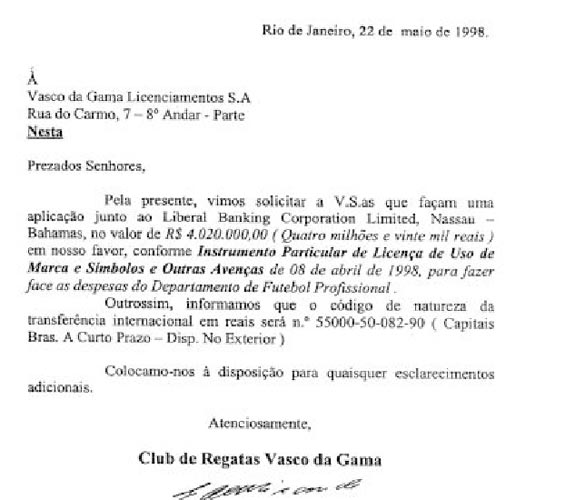 Documento do Vasco assinado por Eurico, na época vice de futebol do clube, pedindo aplicação em favor do Vasco nas Bahamas para fazer face a despesas do depto. de futebol