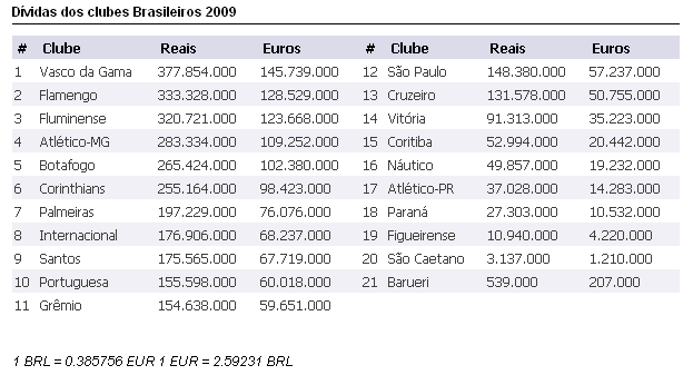 Normalmente são os maiores clubes a acumular o maior endividamento e no Brasil não é excepção. Assim com R$ 377,5 milhões (145,5 milhões de Euros) de dívida, o Vasco da Gama ocupa o primeiro lugar no ranking de devedores, seguido pelo campeão Flamengo e pelo Fluminense com uma dívida estimada em R$ 333,3 milhões (128,4 milhões de Euros) e R$320,7 milhões (123,6 milhões de Euros) respectivamente.