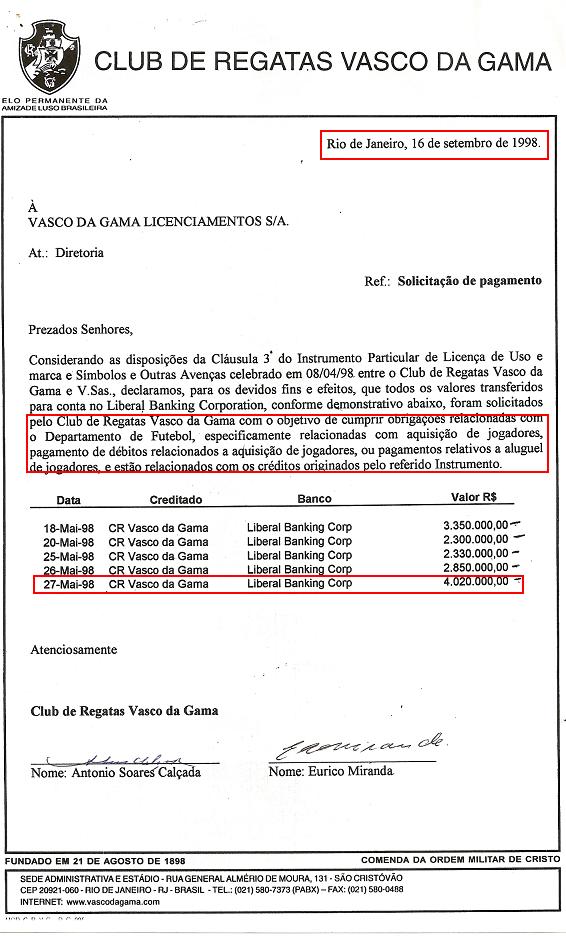 Destaque-se que a Vasco da Gama Licenciamentos foi uma empresa criada pelo Banco Liberal, que era o braço do Nations Bank no Brasil. A Vasco da Gama Licenciamentos, portanto, não foi uma empresa que nasceu do Vasco. Ela foi criada para ser o braço do Nations Bank por onde passavam os negócios do clube com o banco americano. Isso explica muita coisa. O documento abaixo, inclusive com a assinatura do então presidente Antônio Soares Calçada, explica mais ainda.