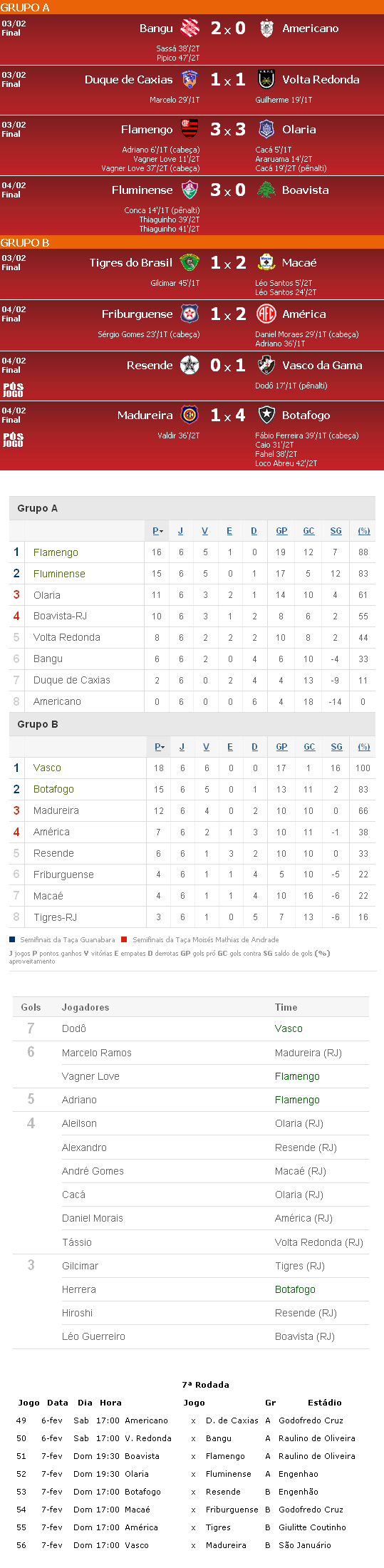 Fonte: NETVASCO (texto), Futebol Interior (resultados, autores dos gols), GloboEsporte.com (classificação, artilharia), Site da FFERJ (próximos jogos) índice | envie por e-mail | espalhe Anterior: 00:01 - Comunidade no entorno de São Januário estão sem luz há 5 dias Próxima: 01:43 - Juvenil: Confira matéria do 'Globo Esporte' com Romarinho |