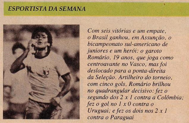 Romário como "esportista da semana" da Revista Placar, ed. 768, de 8 de fevereiro de 1985