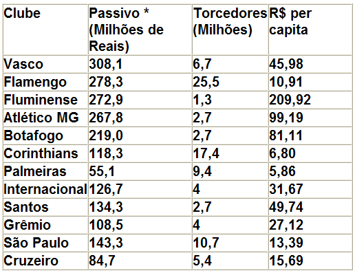 Apenas como parâmetro, se pegarmos o total das dívidas dos clubes no ano de 2008 e dividirmos pelo total de torcedores estimado para janeiro de 2010, chegamos ao resultado de R$ 17,00 – esse é o valor médio que cada torcedor brasileiro deve.