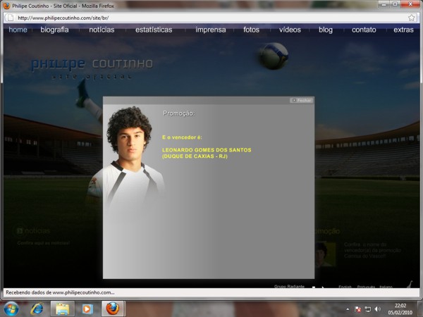 Abaixo a foto de Philipe entregando a camisa ao ganhador e o print da página do site oficial de philipe Coutinho com o nome do felizardo.