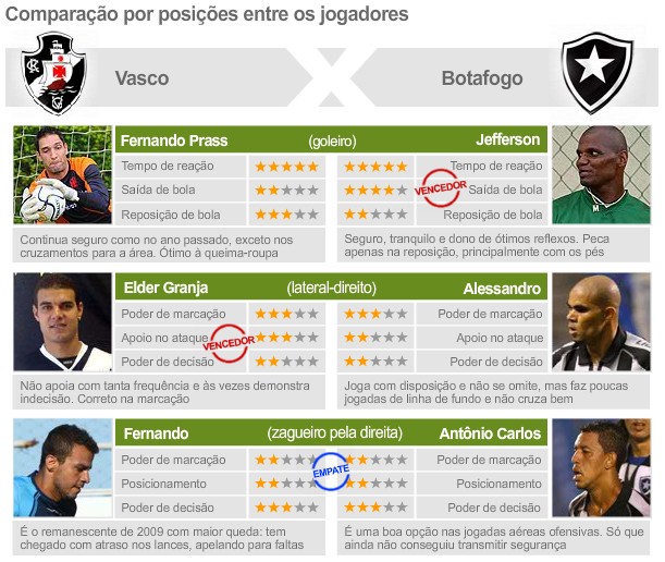 No Raio-X do clássico, levando-se em conta o momento vivido pelos jogadores, a superioridade é vascaína: 6 a 2, com três empates. Confira abaixo a avaliação dos titulares e a análise tática da defesa, do meio-campo e do ataque das equipes. A decisão será realizada às 17h deste domingo, no Maracanã, com transmissão em Tempo Real no GLOBOESPORTE.COM.