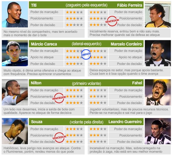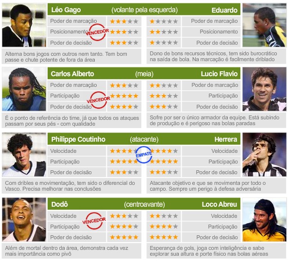 Botafogo: Apesar de jogar com três volantes, o Alvinegro demonstra fragilidade, principalmente porque falta qualidade. Fahel, hoje mais próximo da defesa, é voluntarioso, mas limitado. Esforçado na marcação, pouco acrescenta quando está com a bola nos pés. Eduardo, mais habilidoso, tornou-se um jogador burocrático depois da péssima atuação na goleada sofrida justamente para o Vasco. Arrisca pouco e é facilmente driblado. Assim, Leandro Guerreiro fica muito mais exposto na marcação, pois tem de desdobrar não apenas no meio, mas também na cobertura ao lateral-esquerdo Marcelo Cordeiro, que apoia bastante. Outro sacrificado é Lucio Flavio, que fica como único responsável pela criação de jogadas.