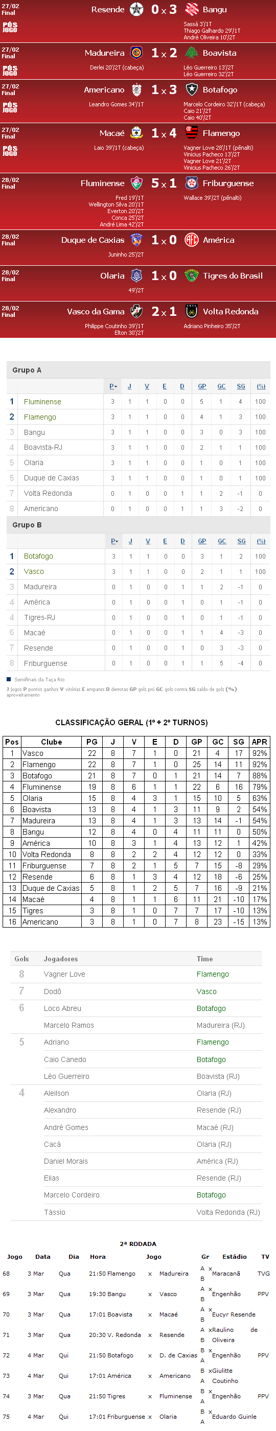 Fonte: NETVASCO (texto, classificação geral), Futebol Interior (resultados, autores dos gols), GloboEsporte.com (classificação, artilharia), Site da FFERJ (próximos jogos) índice | envie por e-mail | espalhe Anterior: 22:12 - Vágner Mancini diz que não entende pouco público em São Januário Próxima: 22:56 - Fernando diz que equipe vascaína ainda precisa evoluir |